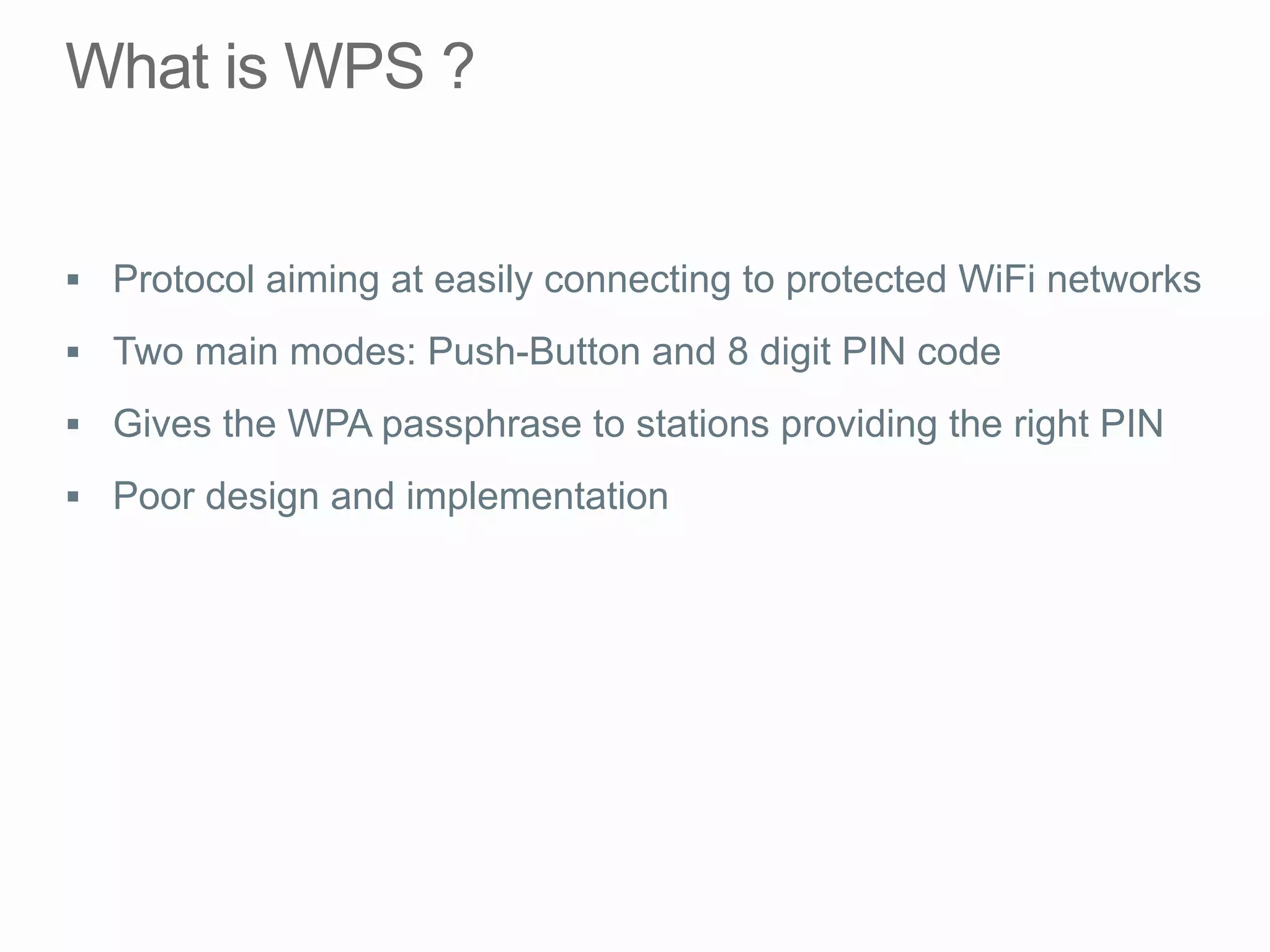 This document discusses offline brute force attacks on WiFi Protected Setup (WPS). It describes how WPS uses an 8-digit PIN code that can be cracked through brute force attacks. It also details the "Pixie Dust" attack method, which recovers the pseudorandom number generator state used by WPS to determine the encryption keys, allowing offline cracking of the PIN and recovery of the WiFi passphrase. The document warns that many access points still have vulnerable WPS implementations and recommends disabling WPS to prevent such attacks.