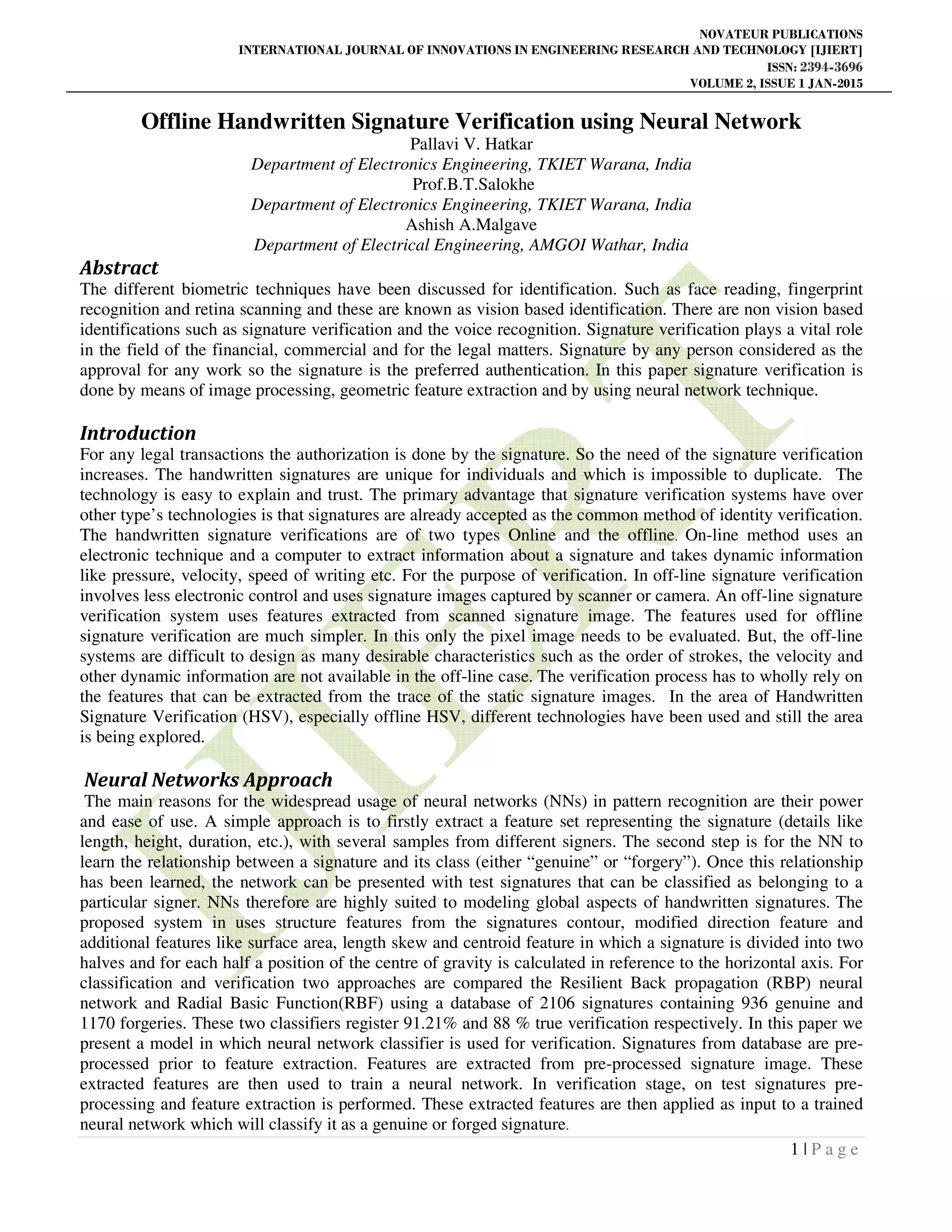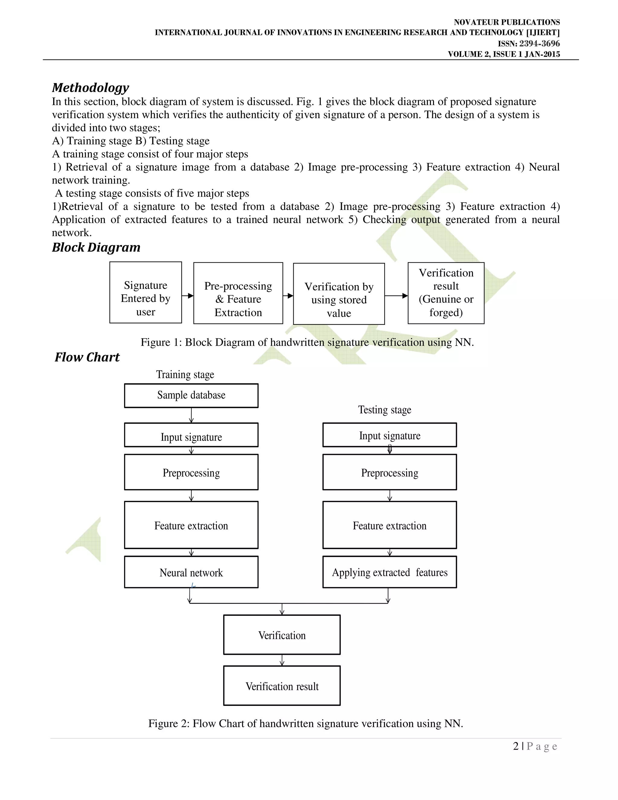 The document discusses a system for offline handwritten signature verification using neural networks, emphasizing the importance of signature verification in legal and financial contexts. It details the methodology involving feature extraction from scanned signature images and the training of neural networks to distinguish between genuine and forged signatures, achieving an accuracy of 86.25%. The system consists of a two-stage process: training involving feature extraction and neural network training, and testing to verify the authenticity of a signature against a pre-trained model.