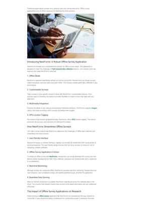 The document discusses the challenges of data collection in field research, particularly the limitations posed by unreliable internet connectivity. It introduces Nestforms, a robust offline survey application designed to facilitate seamless data collection regardless of location. Key features include real-time data capture, custom survey design, multimedia integration, and GPS tagging, all aimed at enhancing research accuracy and productivity.