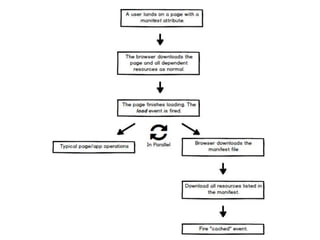 The document discusses the importance and methods of taking web applications offline, focusing on the use of HTML5 application cache and local storage for improved performance and user experience. It highlights the mechanisms for syncing data between the client and server, including conflict resolution strategies, and introduces PouchDB as a tool for managing offline data efficiently. The document concludes with recommendations on when offline capabilities make sense and emphasizes the need for user awareness and control over cached resources.