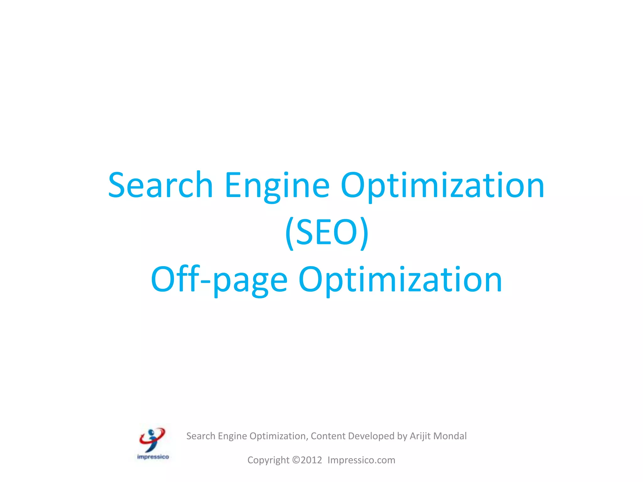 Off-page SEO involves strategies implemented outside a website to enhance its search engine rankings, including methods such as link building, directory submission, social bookmarking, and blogging. Important tactics include submitting to search engines, utilizing Google Places, engaging in forum discussions, and distributing press releases. Caution is advised to avoid spammy practices and reliance on black-hat techniques.