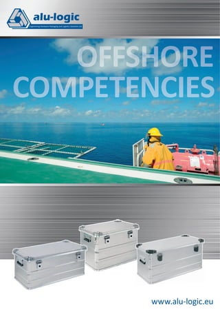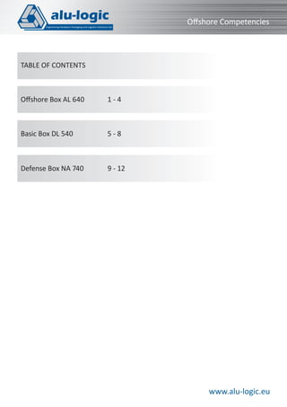 The document provides detailed specifications and features of three types of aluminum boxes: the Offshore Box AL 640, the Basic Box DL 540, and the Defense Box NA 740, which cater to various industrial, manufacturing, and military applications. Each box is crafted for durability, with options for custom sizes and a range of capacities, along with additional features such as adjustable dividers, locks, and sealing to ensure protection under extreme conditions. Architectural elements such as reinforced structures and corrosion resistance are highlighted across the models to assure performance and safety.
