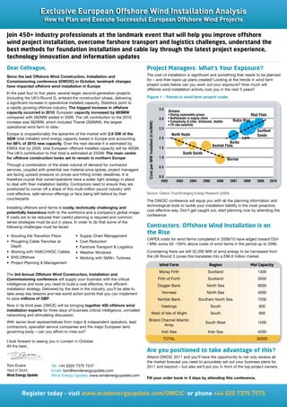 The document advertises the 3rd Annual Offshore Wind Construction, Installation and Commissioning Conference happening in London in October 2011. The conference will gather over 450 delegates from the offshore wind installation industry globally. It will provide opportunities to connect with industry participants, learn about upcoming offshore wind projects and contracts, and discuss challenges and solutions related to offshore wind farm construction, installation techniques, transportation and logistics, risk assessment, and contracting methods. The conference aims to help attendees improve project installation and overcome challenges to successfully generate early revenue from offshore wind farms.