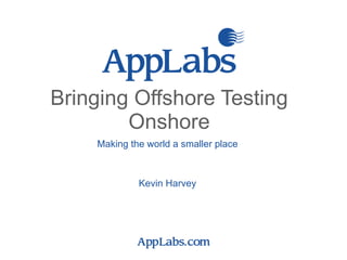 The document discusses bringing offshore testing onshore to reduce costs while maintaining quality. It outlines approaches to build foundations of trust, implement training programs, identify risks, and closely monitor progress. Key steps include securing hardware connections, sharing skills and knowledge, training partnerships, and adding quality assurance layers to build client confidence over time. Within a few months, the integrated onshore-offshore team expanded productivity significantly at low overhead costs with very positive results and client satisfaction.