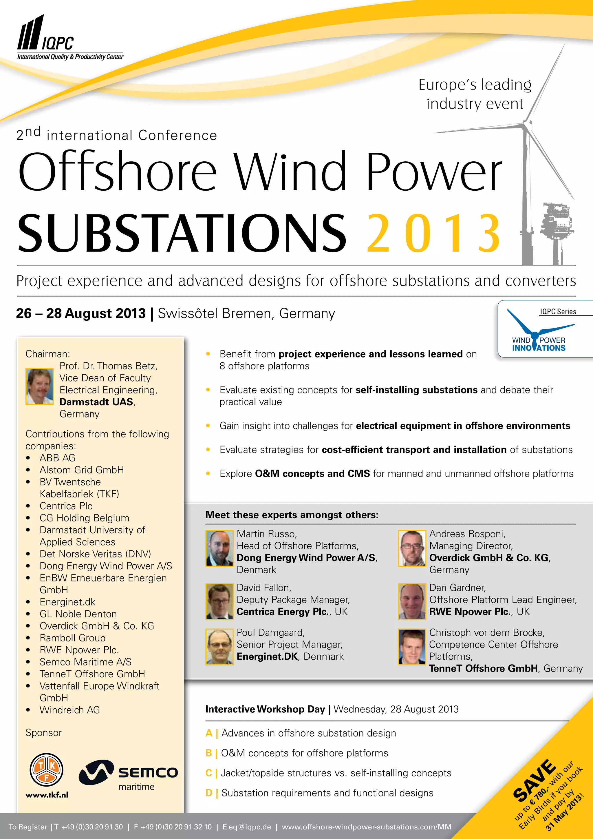 The document outlines the agenda and details for the 2nd International Conference on Offshore Wind Power Substations, held from August 26-28, 2013, in Bremen, Germany. It highlights key topics such as offshore substation design, operation and maintenance concepts, and the evaluation of self-installing substations, featuring insights from various industry experts. Registration information, participating companies, and testimonials from previous attendees emphasize the conference's networking and learning opportunities in the offshore wind sector.