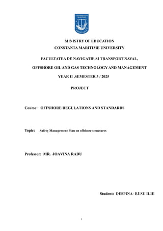 This document presents a safety management plan for offshore structures, emphasizing the importance of safety requirements during their life cycle, particularly in the oil and gas industry. It outlines the risks associated with offshore operations and stresses the necessity for rigorous design and regulatory standards to prevent accidents, which are often exacerbated by human and organizational factors. Historical accident analyses underscore the need for effective safety management and inspections to mitigate potential failures and enhance structural robustness.