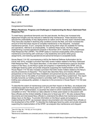 The Navy began implementing its Optimized Fleet Response Plan in November 2014 to address issues stemming from increased ship deployment lengths over the past decade. This included declining ship conditions, a backlog of maintenance, and compressed time for training. The plan aims to maximize the time ships have available for operations while preserving maintenance and training. The report found that prior to the plan, the majority of maintenance availabilities took longer than scheduled, reducing time for training and operations. While only a small portion of the fleet has entered the optimized cycle so far, the first three aircraft carriers completed maintenance over budget, which could impact goals. Public and private shipyards face challenges completing maintenance on time, including unanticipated work, inexperienced workers, and