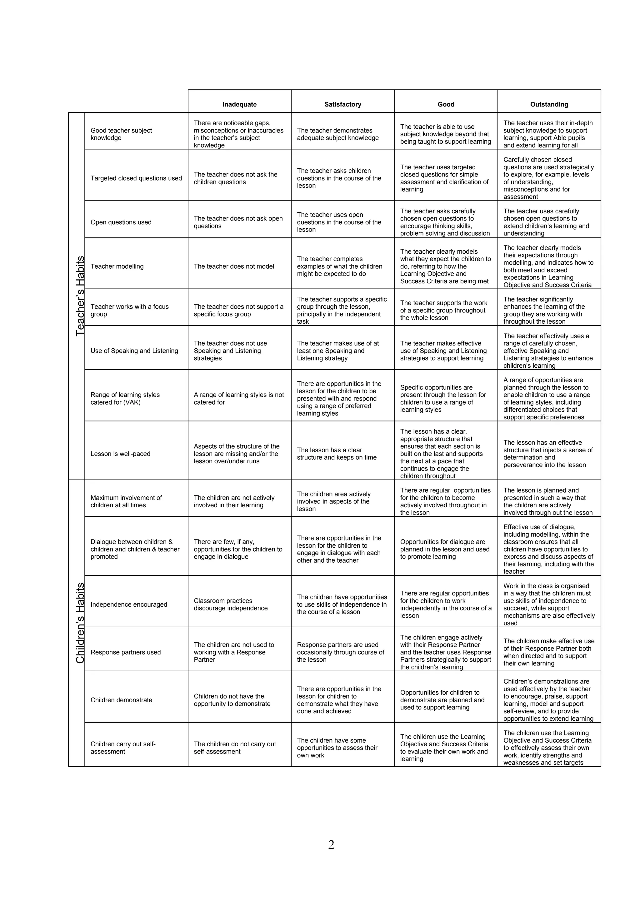 The document provides descriptors for key indicators of lesson quality according to Ofsted's inspection framework, ranging from inadequate to outstanding. It describes characteristics for areas such as the classroom environment, use of resources, deployment of teaching assistants, questioning techniques, and involvement of students. An outstanding lesson is characterized by highly effective planning, strong teacher subject knowledge, strategic use of questioning, active involvement of all students, and opportunities for independent learning and self-assessment.