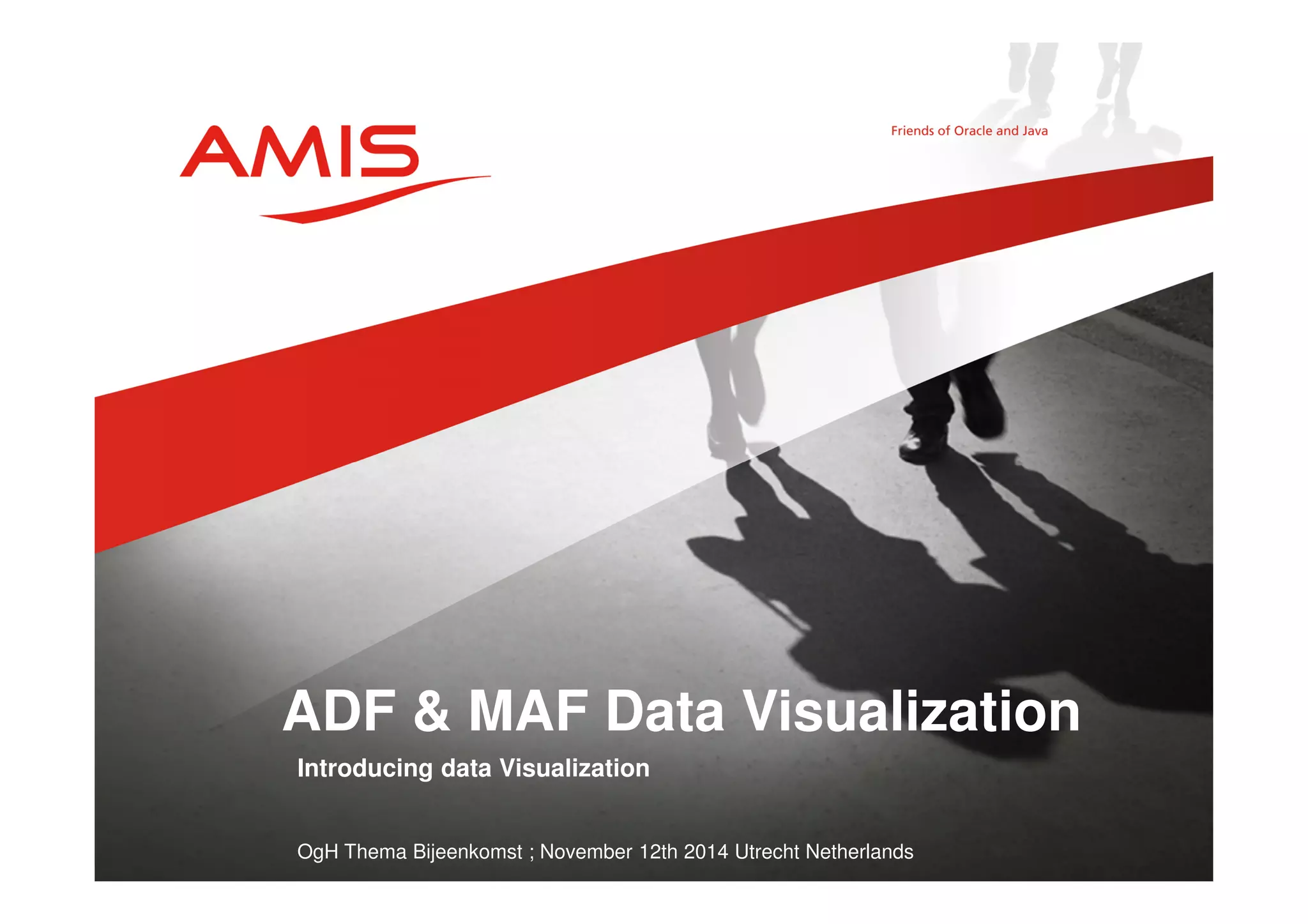 This document discusses a presentation on data visualization using Oracle ADF and MAF. The presentation introduces data visualization and its uses, explores various types of visualizations including graphs, charts, maps, timelines and bubbles, and looks at data visualization on mobile. It is delivered by Luc Bors and Frank Houweling from AMIS in the Netherlands on November 12th, 2014 in Utrecht.