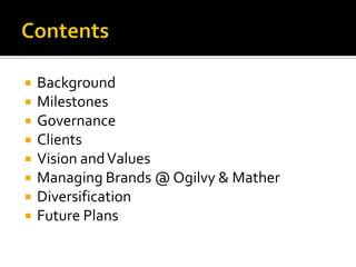Ogilvy and Mather is a large global advertising agency founded in 1948 that operates 497 offices in 125 countries. It helps build recognizable brands and is led by CEO Miles Young and other top executives. The agency focuses on 360-degree brand stewardship through discovery, strategy, and execution. It has diversified into areas like public relations, digital and interactive marketing, and Islamic branding. Ogilvy aims to transition to producing content and collaborating more closely with consumers through co-creation, thought leadership, and digital marketing.