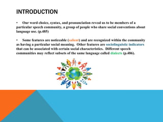 The document discusses the connections between language use, social distinctions, and speech communities, highlighting how features like pronunciation and syntax can reveal social identities. It explores variations in language due to factors such as age, class, ethnicity, and gender, as well as the impact of isolation and contact with other languages. Additionally, it addresses how societal attitudes toward language can influence perceptions of prestige and power within communities.