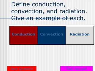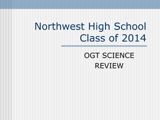 This document provides a review for the OGT Science test covering concepts of heat transfer, conduction, convection and radiation. It defines each term and provides an example. It then has multiple choice questions to test understanding. The document discusses atomic structure, fission and fusion processes. It defines key terms and has additional practice questions. Finally, it covers properties of stars and how they are created and produce energy through nuclear fusion.