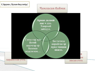 нь нийтийн төлөө нийт нь нэгийн төлөө “ “гэсэн сэтгэлээр Эвтэй байхдаа хүчтэй байж “ ”Хүн хийж чадна гэсэн бүхнээ хийж чаддаг гэсэн өөртөө итгэх итгэлээр жигүүрлэн цаг .хугаацаатай уралдан зорилгодоо хүрцгээе Түншдээ хандах Зэрэгцүүлэн тэмдэглэл хөтлөх