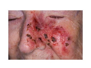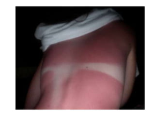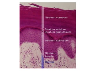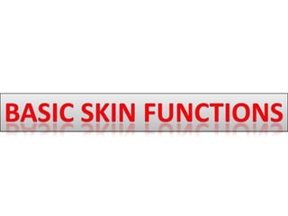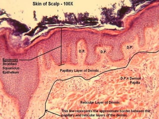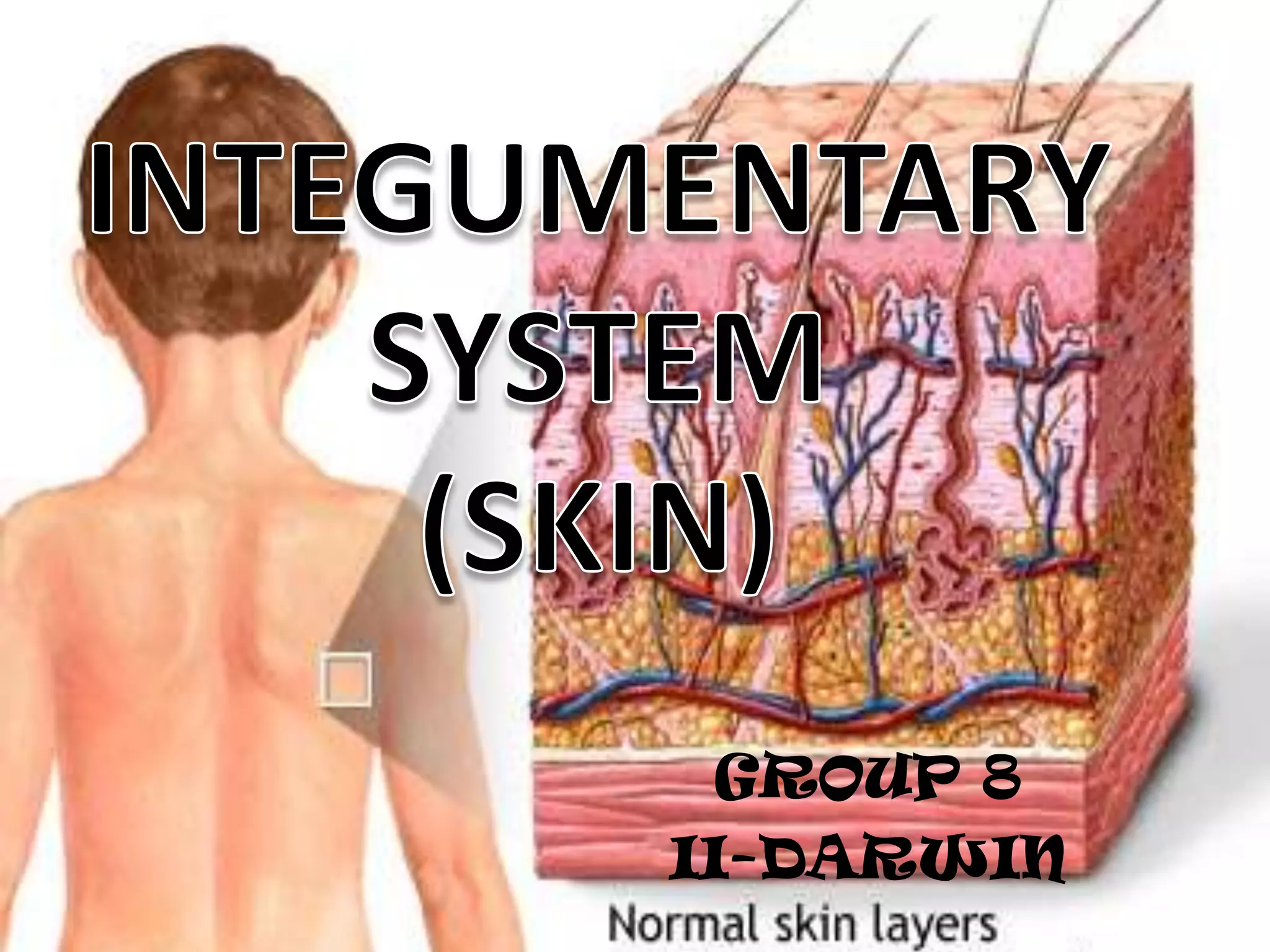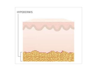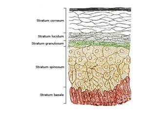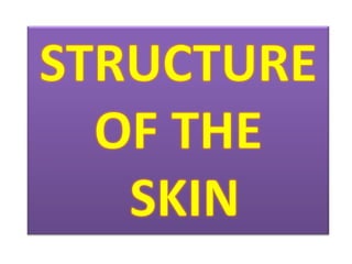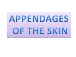 The document discusses the structure and functions of the skin and its appendages. It describes the layers of the skin - epidermis, dermis and hypodermis - and explains their composition and roles in protection, insulation, and other physiological functions. It also discusses various skin conditions like rashes, blisters, athlete's foot, sunburn, albinism and skin neoplasms, and provides prevention tips for some of these conditions.
