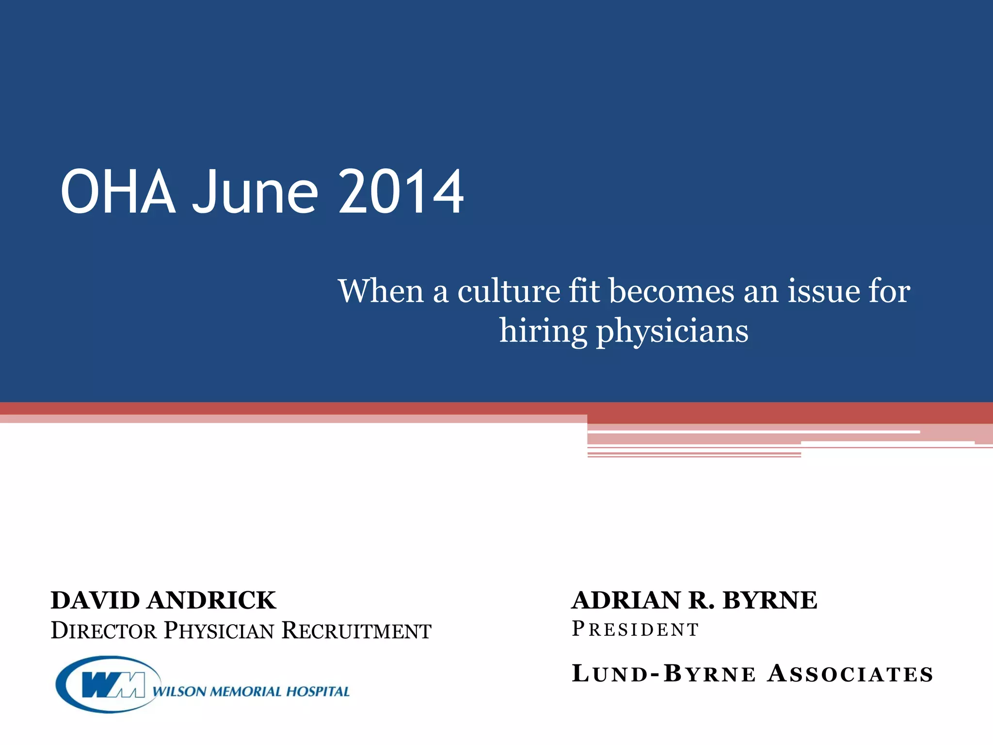 The document discusses the significance of corporate culture in physician recruitment, highlighting how it influences employee interactions and impacts organizational performance. It outlines factors that define culture, the importance of cultural fit in hiring, and how various physician demographics perceive organizational culture. Additionally, it emphasizes the competitive advantage that a well-established culture can provide in the recruitment and retention of physicians.