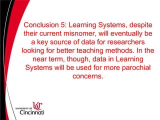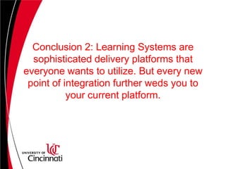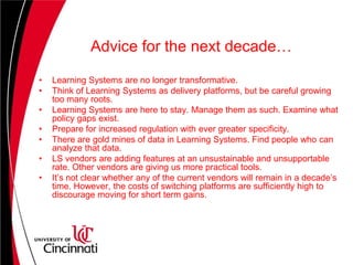 Learning systems are mature platforms that are core to institutional operations but bring challenges around accountability, regulation, and data management. While once transformative, they are now sophisticated delivery mechanisms tightly integrated into academic plans. Increased scrutiny requires the same governance approach as other institutional systems. Continued evolution of the market and emerging tools from other vendors will impact long term platform choices, despite high costs of switching.