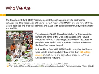 The Ohio Benefit Bank is a public-private partnership that provides a free online tool to help Ohioans assess eligibility and apply for over 20 state and federal assistance programs. It is implemented through the Ohio Association of Second Harvest Foodbanks and partner organizations. The Benefit Bank has helped over 273,000 individuals access over $577 million in benefits, tax credits, and other assistance. It offers three site models - counselor assisted, self-serve, and professional edition - to help individuals complete applications and tax returns.