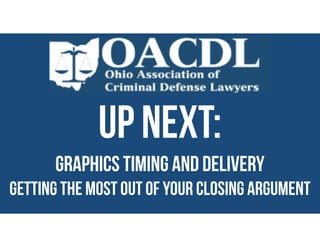 The document provides tips for an effective closing argument, including using graphics, timing, and delivering information to maximize retention by the jury. It discusses adding breaks to allow jurors to process information and using rhetorical devices and storyboarding to engage the jury. Science shows that breaking up content and silence improves retention. The document encourages planning breaks and remembering to use visualization tools to aid the jury's memory of key points.