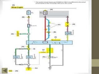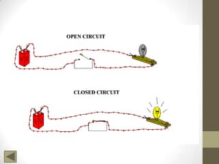 Ohm's Law describes the relationship between voltage, current, and resistance in an electrical circuit. Voltage is the "push" of electricity and is measured in volts. Current is the flow of electricity and is measured in amps. Resistance opposes the flow of current and is measured in ohms. Ohm's Law states that current is directly proportional to voltage and inversely proportional to resistance. Using Ohm's Law, the voltage, current, or resistance in a circuit can be calculated if two of the three values are known. Resistors are used to decrease voltage in a circuit and are marked with color bands to indicate their resistance value. Circuits can be connected in series or parallel, and understanding circuit diagrams
