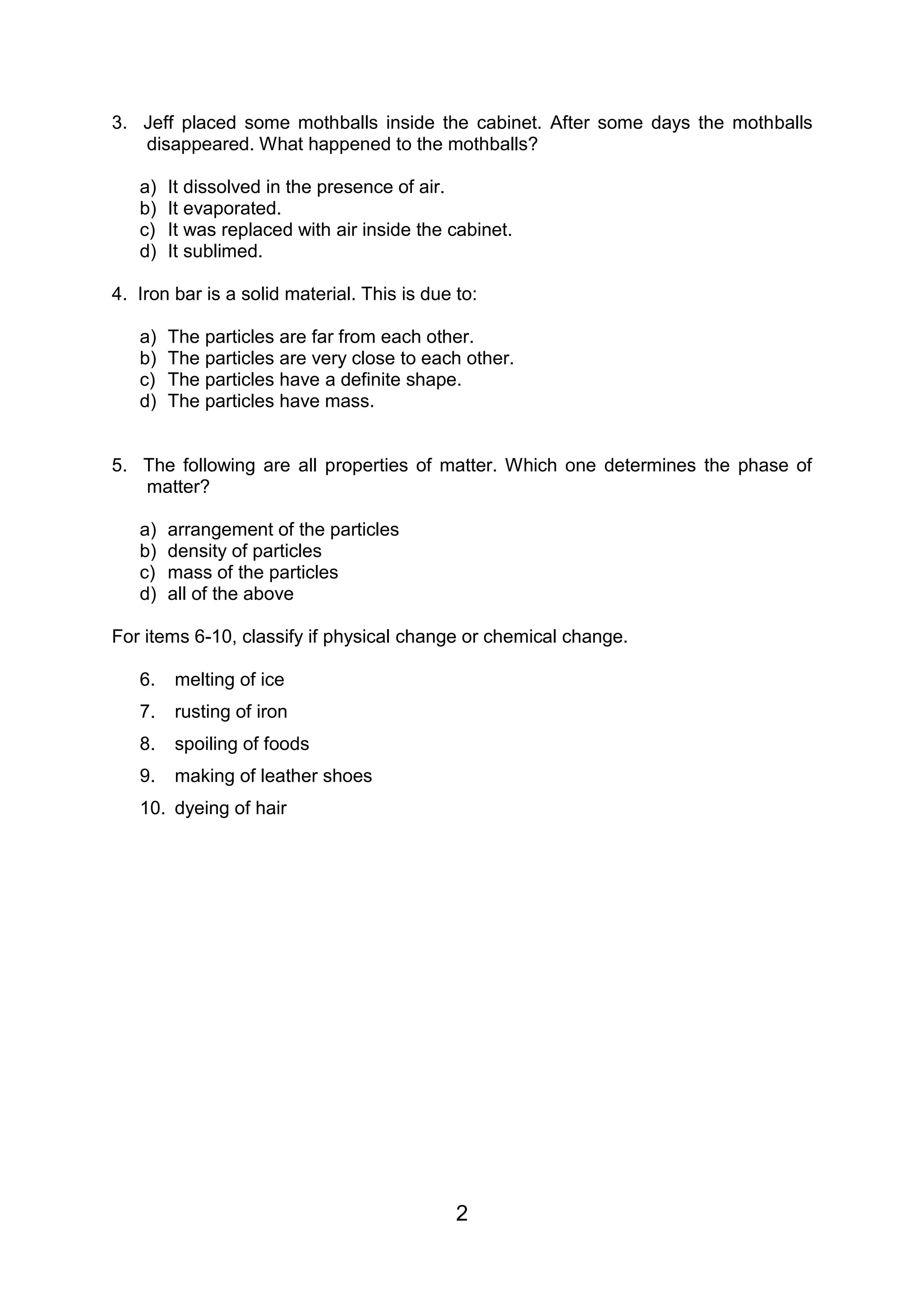 This document provides an overview of an integrated science course covering matter, its properties, and changes. The course is divided into four quarters, with the first quarter focusing on the scientific method and matter. This specific module covers topics related to matter, its properties, and changes. It includes two lessons - one on the properties, changes, and classification of matter, and another on the beneficial effects of physical and chemical changes on health and the environment. The module introduces students to the basic concepts of matter and its three main states (solid, liquid, gas), as well as mixtures and pure substances. It includes several hands-on activities for students to explore these concepts through observation and experimentation.