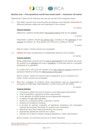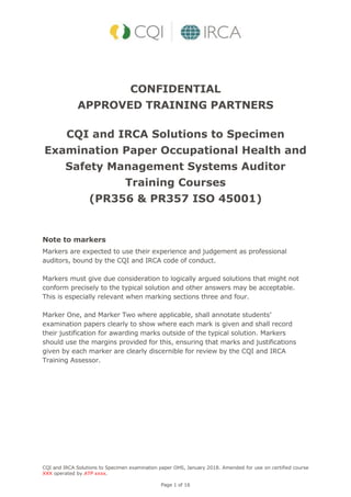 The document provides solutions to an examination paper for an Occupational Health and Safety Management Systems Auditor training course. It includes sample answers and guidance for markers on sections covering topics like the responsibilities of lead auditors, how auditors should respond to issues found during audits, and the corrective action process as outlined in ISO 45001. The solutions describe essential elements auditors should examine and parties responsible at different stages of the corrective action process.