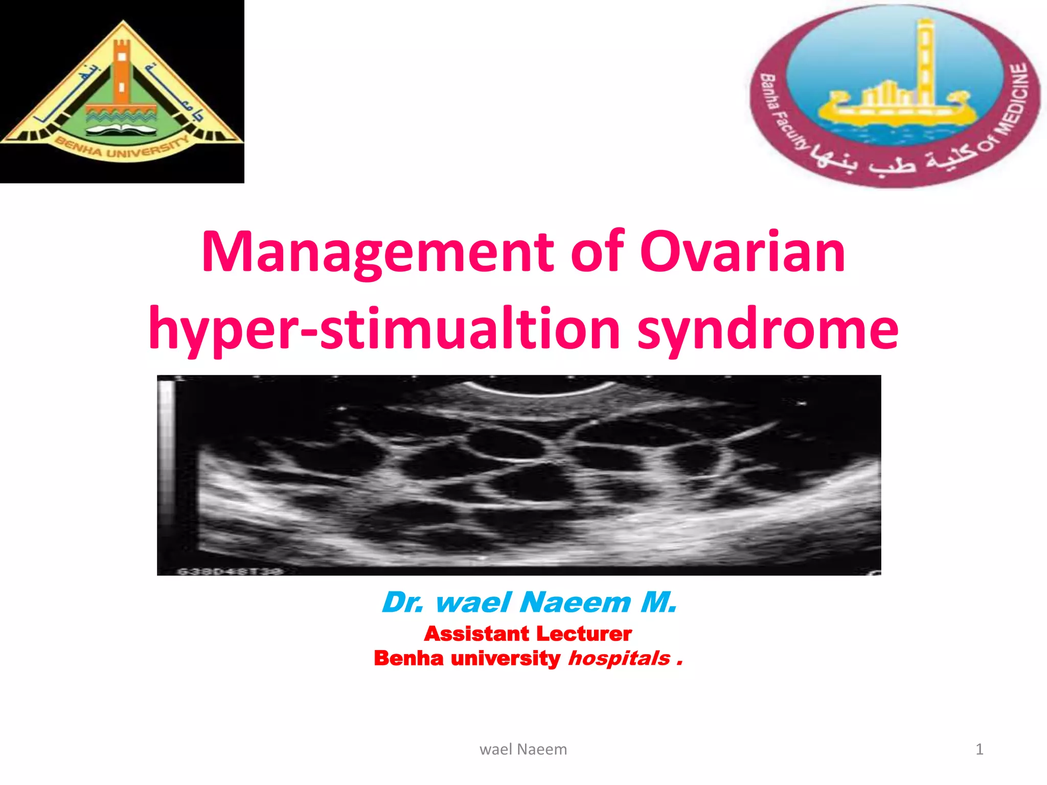 This document discusses the management of ovarian hyperstimulation syndrome (OHSS). It covers the background, pathophysiology, clinical presentations, complications, prevention, and treatment of OHSS. Prevention strategies include reducing gonadotropin doses, using GnRH antagonists, reducing or avoiding HCG, cycle cancellation, and cryopreservation of embryos. Treatment involves reassurance, fluid management, analgesia, thromboembolism prophylaxis, and paracentesis for ascites. Hospitalization is required for uncontrolled pain, inability to maintain fluids, or worsening signs like shortness of breath.