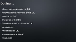 The Organization of Islamic Cooperation (OIC) was established in 1969 to promote cooperation among Muslim-majority countries. It has 57 member states and is headquartered in Saudi Arabia. The OIC aims to enhance solidarity and protect shared Muslim interests globally. However, it has been criticized for its inability to resolve major crises affecting the Muslim world or improve economic cooperation among its members. While the OIC has coordinated humanitarian aid and adopted resolutions supporting Palestinian rights, it has largely failed to establish lasting peace or security across the Muslim world.