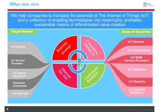 OIES Consulting provides IoT strategic consulting and business development services to help companies translate IoT potential into meaningful value. Their services include IoT strategy, market entry plans, solution architecture, and business planning. They target IoT vendors, service providers, system integrators, and enterprises in industries like manufacturing, retail, insurance, and more.