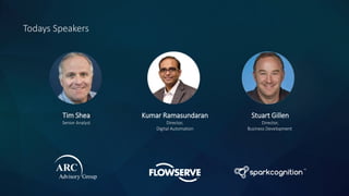 The document discusses the importance of predictive technologies and cognitive analytics in the oil and gas industry, emphasizing the need for innovation due to low oil prices and disruptions. It outlines how the Industrial Internet of Things (IIoT) can enhance operational efficiency and reduce costs through predictive maintenance and data analytics. Additionally, it provides a case study on Flowserve, illustrating the successful implementation of predictive analytics for pump failure monitoring, achieving significant improvements in advance warning and accuracy.