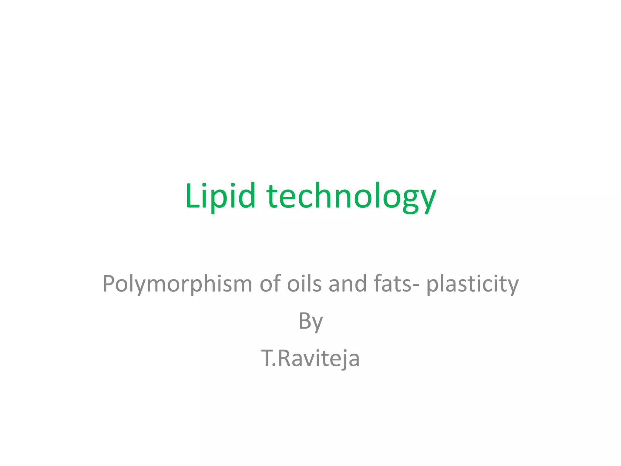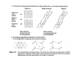 Polymorphism refers to the ability of a substance to exist in multiple crystalline forms. Fats and oils can exist in three main polymorphic forms - alpha, beta prime, and beta - with increasing stability. The transitions between forms occur with increasing temperature in the order of alpha to beta prime to beta. Methods for studying polymorphism include differential scanning calorimetry, which measures the heat of crystallization, and nuclear magnetic resonance spectroscopy, which determines the solid fat content during crystallization. Plasticity, the ability of a fat to be spread, arises from fats melting over a range of temperatures as different fatty acid components melt at different temperatures rather than at a single fixed point.