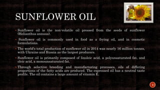 The document discusses the production of sunflower oil. It begins by describing that sunflower oil is pressed from sunflower seeds and is commonly used for cooking. It then outlines the key steps in sunflower oil production, which include cleaning and grinding the seeds, pressing or extracting the oil using a screw press or solvents like hexane, removing solvent traces through distillation, and refining the oil by removing impurities and odors. The final product is refined edible sunflower oil, while the main byproduct is sunflower seed cake which is used for animal feed or fertilizer.