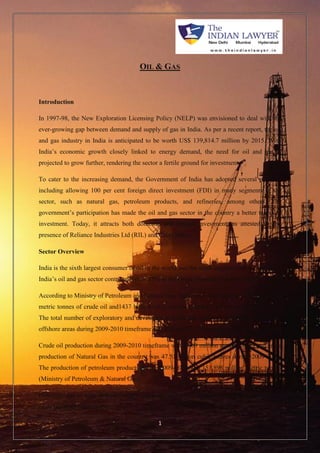 The document summarizes investment opportunities in India's oil and gas sector. It notes that India is the 6th largest consumer of oil globally and imports over 60% of its needs. Several policies encourage 100% foreign investment in areas like natural gas and refineries. The sector attracted $5.13 billion between 2000-2014. Major companies like Reliance and ONGC are investing billions in exploration, drilling, and offshore projects. With demand projected to greatly outpace domestic supply, the document outlines opportunities in areas like shale gas, pipelines, refining and technology partnerships to boost upstream production.
