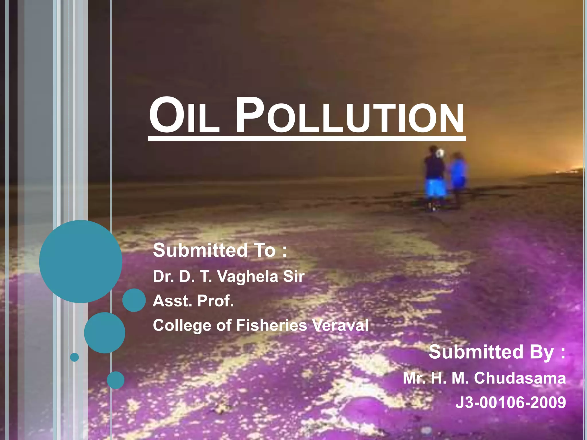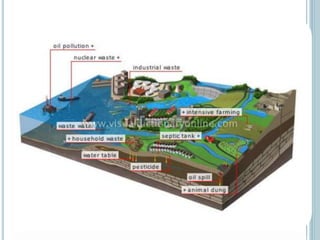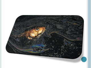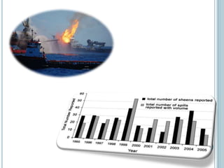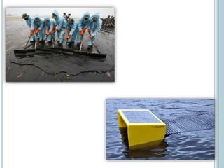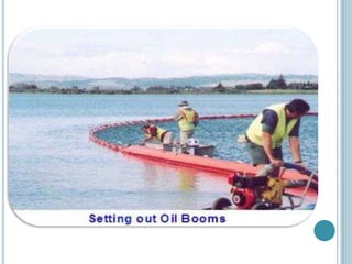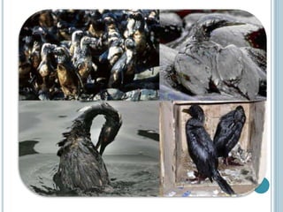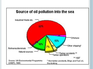 This document discusses oil pollution from spills. It begins with an introduction that describes how oil spills harm the environment and are difficult to clean up. It then covers topics like the composition of crude oil, sources of oil pollution such as tanker accidents and pipeline leaks, methods for treating oil spills, the toxicity of petroleum, and the ecological impacts of oil in the environment. Specific case studies of major oil spills are also mentioned such as the Exxon Valdez and some spills that occurred in India.