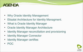 The document discusses Oracle Identity Manager, including its architecture and capabilities. It describes Oracle Identity Manager as an application that handles tasks related to managing user access privileges, such as creating, modifying, and removing access privileges. It then outlines Oracle Identity Manager's architecture, which includes presentation, server, and data/enterprise integration tiers. The presentation tier includes administrative and design consoles. The server tier provides services to logical components. And the data/enterprise integration tier includes data access and backend database layers.