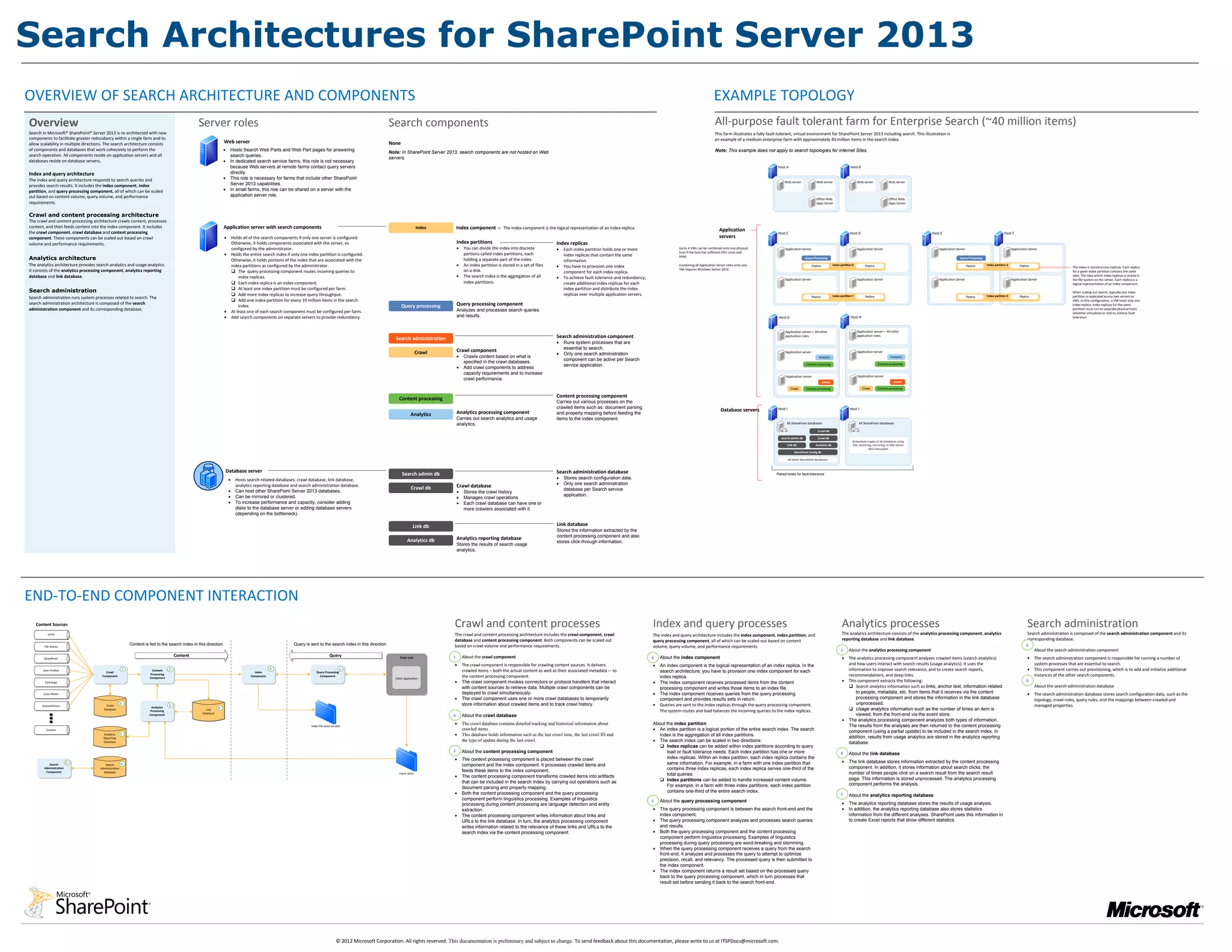 The document provides an overview of the search architecture in SharePoint Server 2013, including its components and how they interact. The search architecture consists of components that crawl content, process it, feed it into the index, route queries to the index, and provide analytics. It can be scaled out by adding more replicas of components like the index or by partitioning the index across servers. The document includes an example topology with redundant servers hosting fault-tolerant search components for a medium-sized farm.