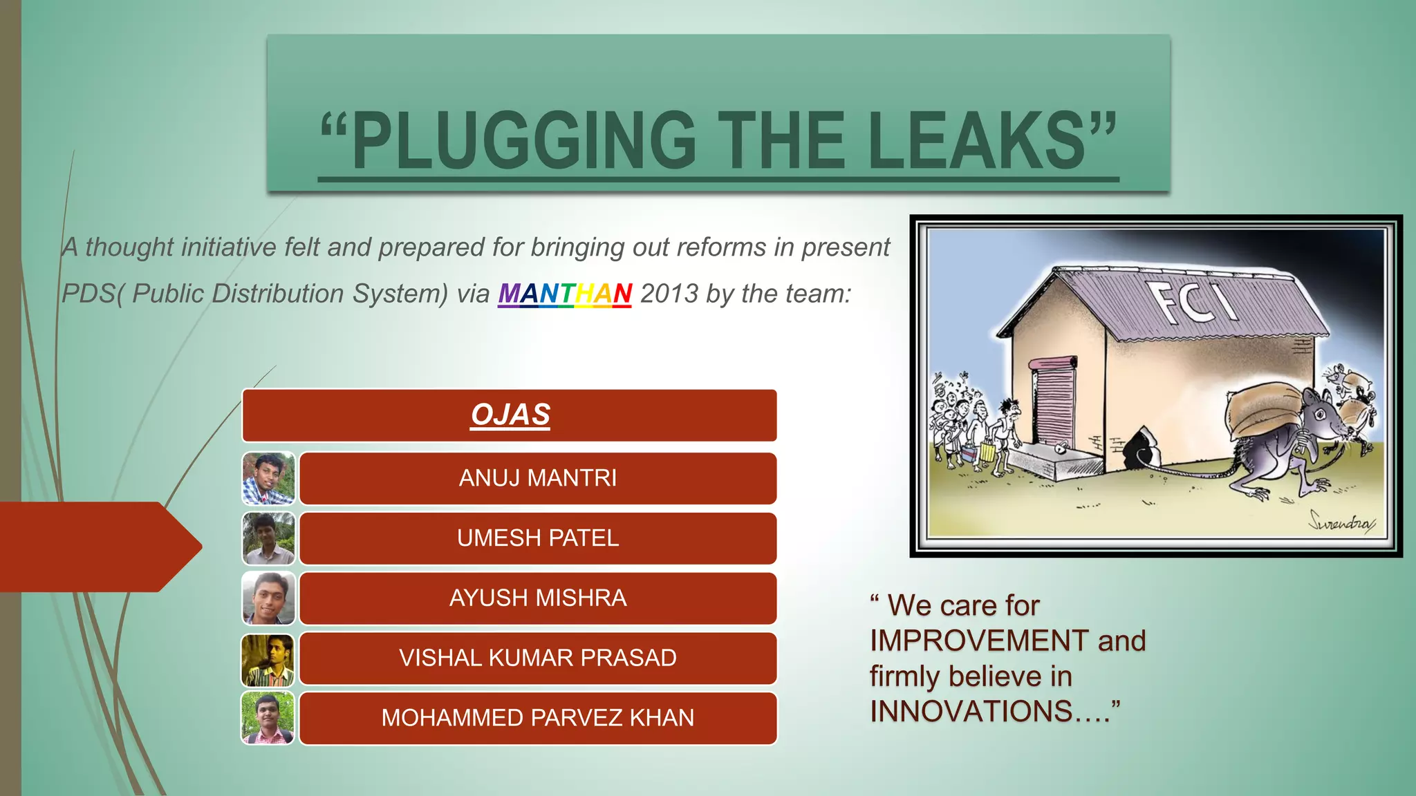 The document proposes reforms to improve India's Public Distribution System (PDS) by reducing leaks and increasing transparency. It analyzes problems at each stage of the PDS process from procurement to distribution. A new system is proposed using a centralized database, electronic ID cards, packaged food grains, community inspectors, and informers. This system aims to increase transparency, accountability, and access while reducing diversion and leaks estimated to cost over $3 billion annually. Initial costs are estimated but the system is intended to save substantial funds by plugging PDS leaks.