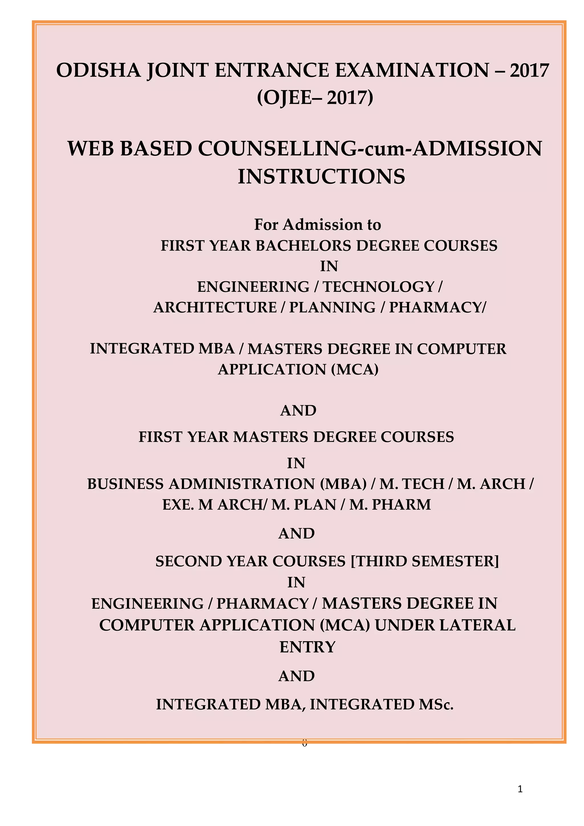 This document provides instructions for the web-based counselling and admission process for various undergraduate and postgraduate courses in Odisha, India. It outlines the important dates and steps in the process, including downloading rank cards, registering online, filling and locking choices, temporary allotments, fee payment, document verification at nodal centers, and final allotment. The eligibility criteria for different courses and reservations policies for various categories are also described. The document aims to guide candidates through the online counselling procedure.