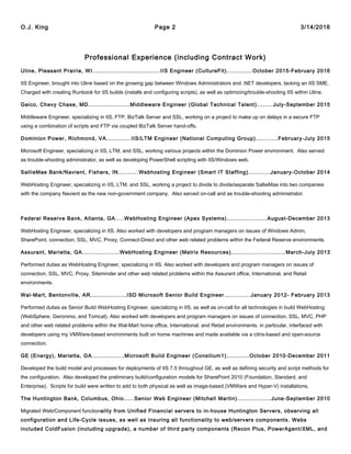 This document contains a summary of O.J. King's professional experience and qualifications. It lists over 15 years of experience in Windows administration, with specialties in IIS, SQL, Exchange, virtual environments, and transaction-based data connections. Recent roles include IIS engineering positions at Uline, Geico, Dominion Power, and SallieMae Bank, where responsibilities involved IIS configuration, optimization, and troubleshooting. O.J. King also has experience with SharePoint, .NET, clustering, load balancing, and web development tools. The document provides details on additional roles and responsibilities spanning two decades in the IT industry.