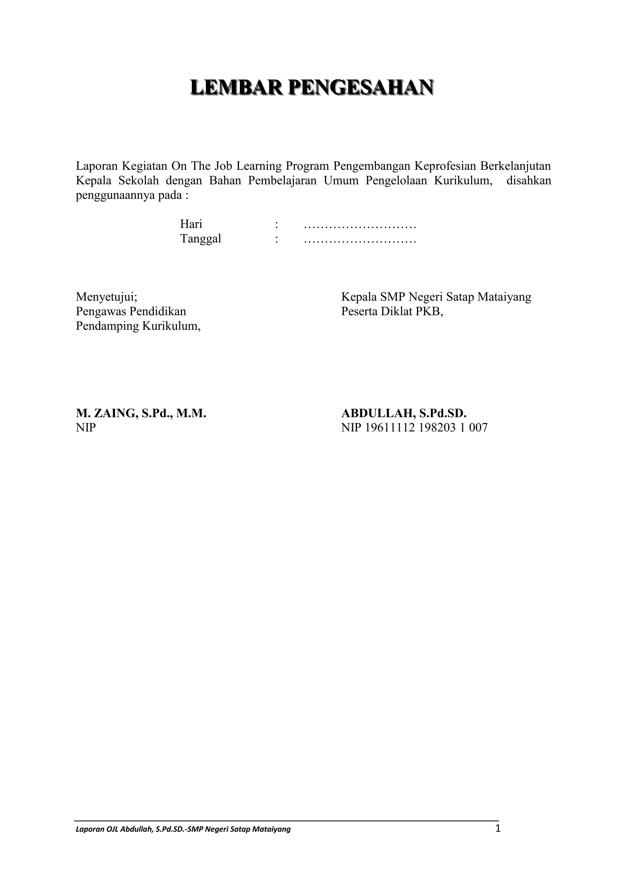 Dokumen ini adalah laporan kegiatan on the job learning program untuk pengembangan keprofesian berkelanjutan kepala sekolah di SMP Negeri Satap Mataiyang yang melibatkan pelaksanaan kurikulum 2013. Laporan ini mencakup analisis dan evaluasi kegiatan pendampingan guru dalam kurikulum, serta refleksi dan rekomendasi mengenai pengembangan kurikulum. Diharapkan laporan ini memberikan gambaran jelas mengenai pelaksanaan dan hasil kegiatan tersebut.