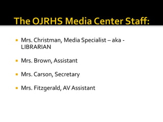 The document outlines the rules and procedures for using the school library, including access times, how to sign in and out, and acceptable uses of the space and equipment. It emphasizes the importance of maintaining a quiet study environment, the check-out duration for materials, fines for late returns, and proper handling of library resources. Students are encouraged to utilize online databases and the library's catalog for research purposes.