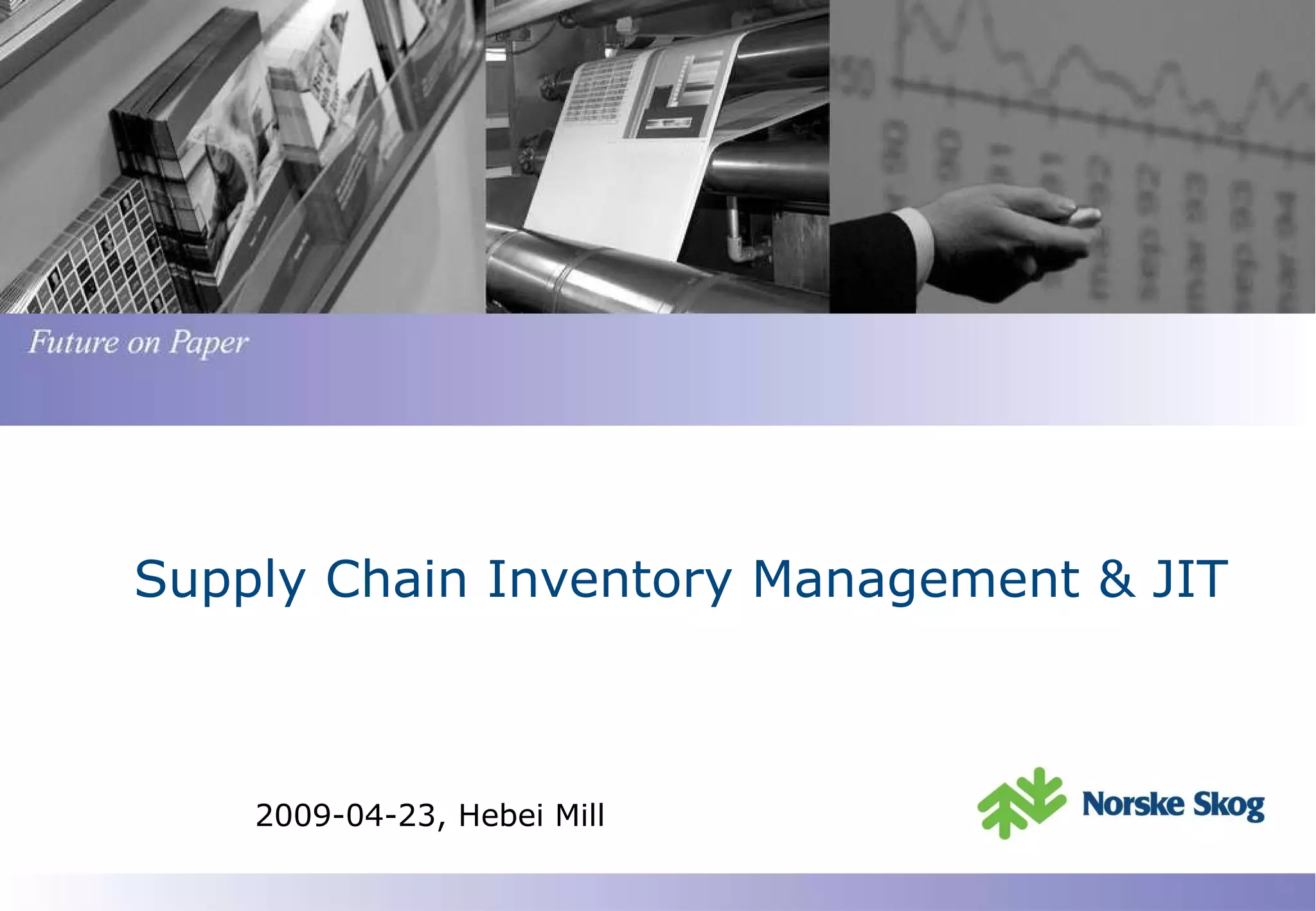 The document discusses inventory management and just-in-time (JIT) practices. It describes different types of inventory including raw materials, work-in-process, and finished goods. It also discusses inventory-related costs and reasons for inventory investment. The document then covers managing inventory through volume, value, and velocity. It provides examples of powerful ways to manage inventory and creating a lean supply chain using JIT purchasing, transportation, and production principles.