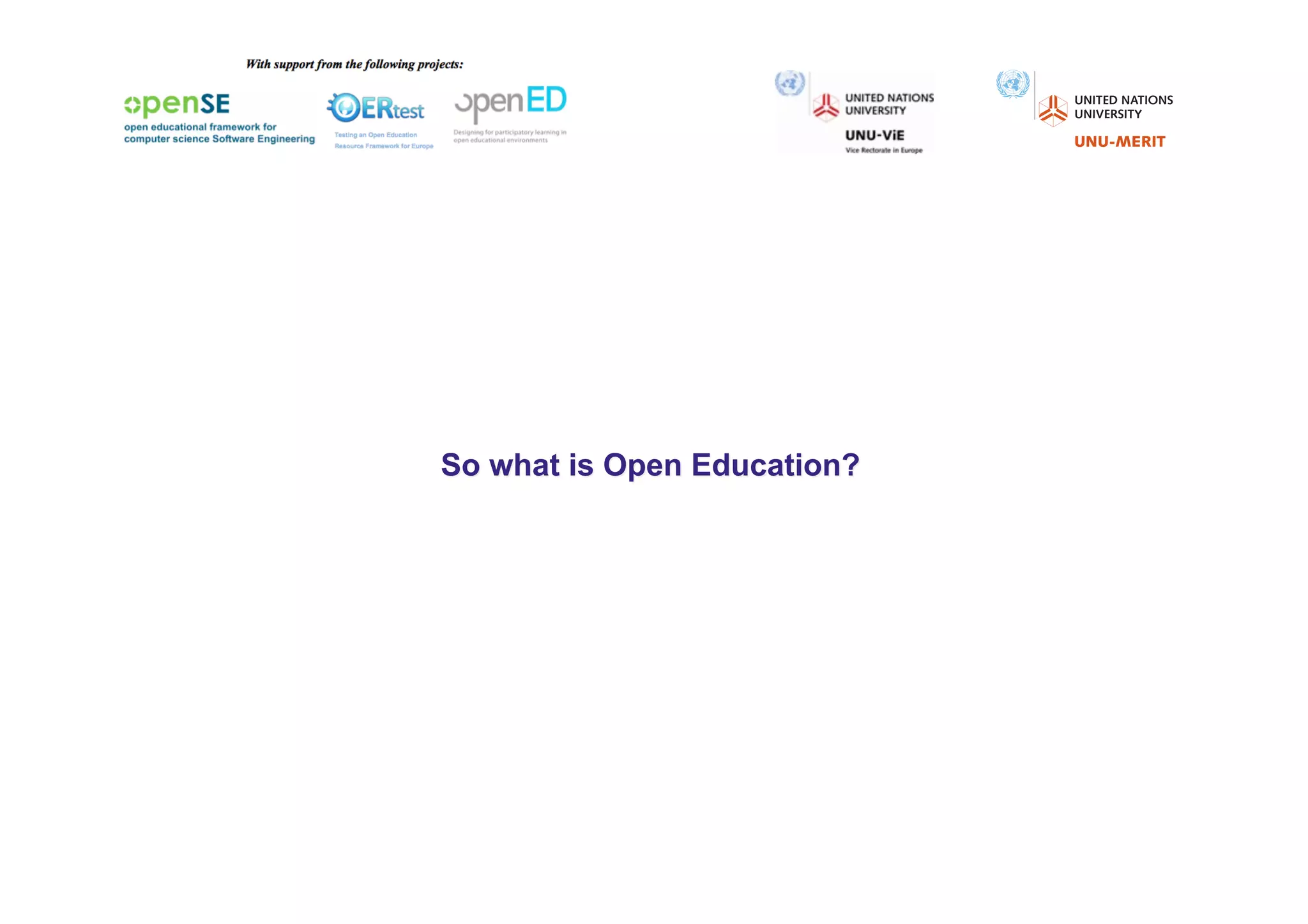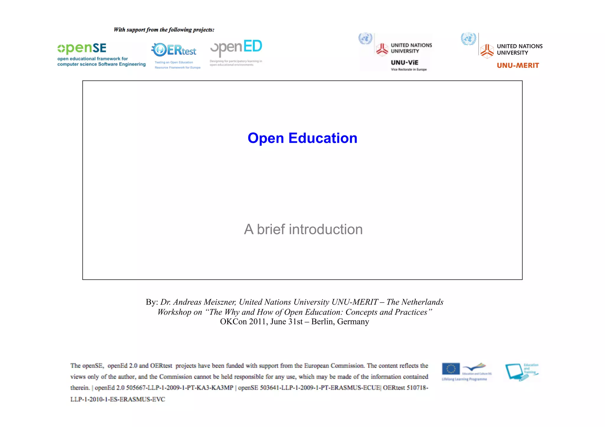 The document provides an overview of open education by Dr. Andreas Meiszner, discussing its distinctions from traditional formal education and the evolving landscape of learning through open educational resources and courses. It emphasizes that the definition of open education varies based on how education is defined, particularly regarding the importance of degrees and certifications. The presentation concludes by suggesting that the classification of education is not simply binary but has multiple dimensions.
