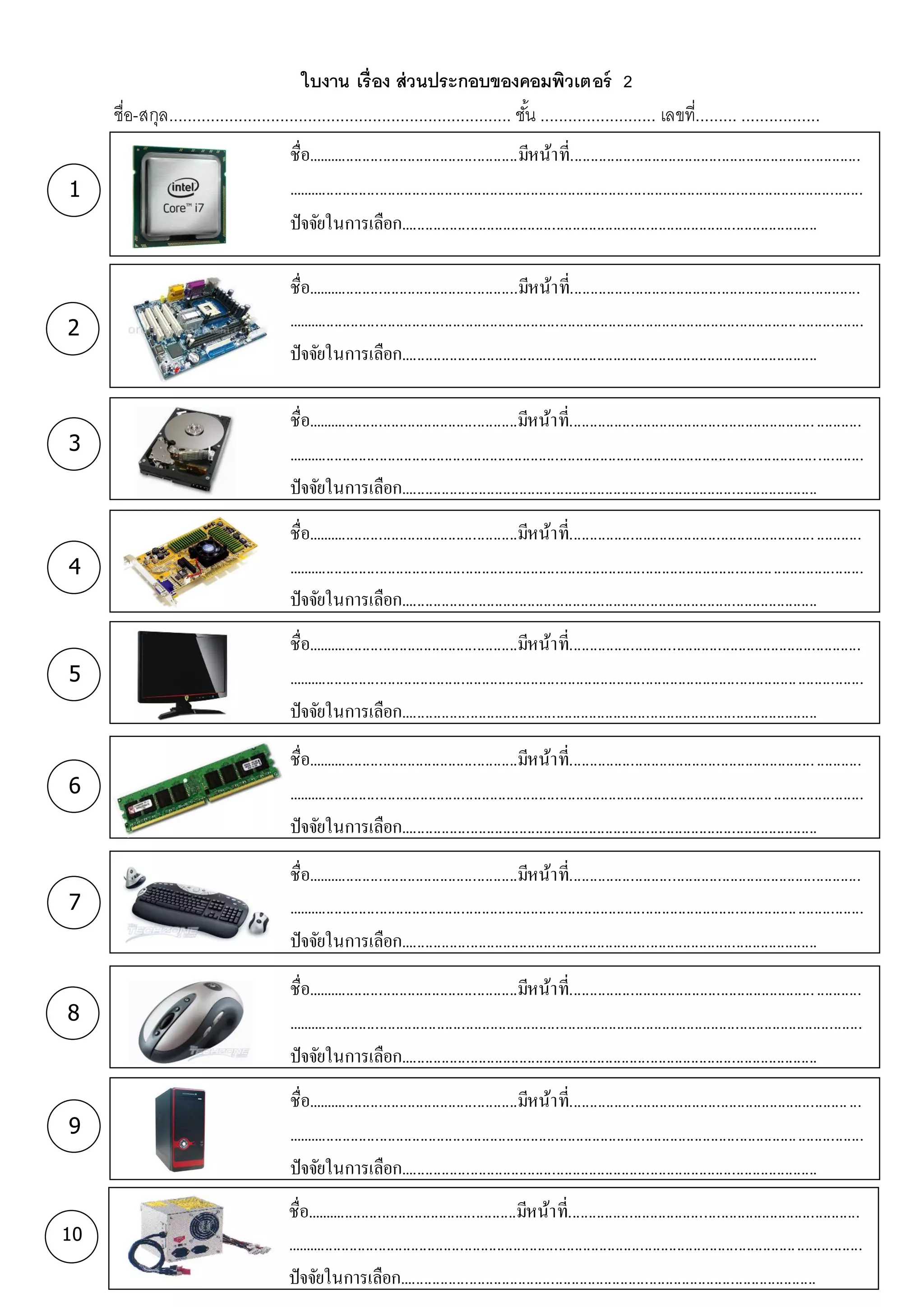 ส่ วนประกอบของคอมพิวเตอร์ 2 ชื่อ-สกุล.......................................................................... ชัน ......................... เลขที่......... ................. ้ 1 ชื่อ....................................................มีหน้า ที่....................................................................... ............................................................................................................................................. ปั จจัยในการเลือก...................................................................................................... 2 ชื่อ....................................................มีหน้า ที่....................................................................... ............................................................................................................................................. ปั จจัยในการเลือก...................................................................................................... 3 ชื่อ....................................................มีหน้า ที่............................................................ ........... ............................................................................................................................................. ปั จจัยในการเลือก...................................................................................................... 4 ชื่อ....................................................มีหน้า ที่............................................................ ........... ............................................................................................................................................. ปั จจัยในการเลือก...................................................................................................... 5 ชื่อ....................................................มีหน้า ที่....................................................................... ............................................................................................................................................. ปั จจัยในการเลือก...................................................................................................... 6 ชื่อ....................................................มีหน้า ที่............................................................ ........... ............................................................................................................................................. ปั จจัยในการเลือก...................................................................................................... 7 8 9 10 ชื่อ....................................................มีหน้า ที่....................................................................... ............................................................................................................................................. ปั จจัยในการเลือก...................................................................................................... ............................................................................................................................................. ชื่อ....................................................มีหน้า ที่............................................................ ........... ............................................................................................................................................. ปั จจัยในการเลือก...................................................................................................... ............................................................................................................................................. ชื่อ....................................................มีหน้า ที่.................................................................... ... ............................................................................................................................................. ปั จจัยในการเลือก...................................................................................................... ............................................................................................................................................. ชื่อ....................................................มีหน้า ที่....................................................................... ............................................................................................................................................. ปั จจัยในการเลือก......................................................................................................