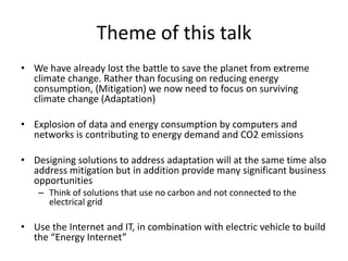This document summarizes a presentation about using information and communication technologies (ICT) to adapt to rather than mitigate global warming. Some key points: