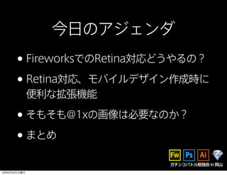 今日のアジェンダ •FireworksでのRetina対応どうやるの? •Retina対応、モバイルデザイン作成時に 便利な拡張機能 •そもそも@1xの画像は必要なのか? •まとめ ガチンコバトル勉強会in岡山 13年6月23日日曜日