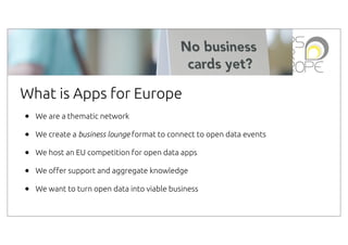 This document discusses Apps for Europe, a network that aims to connect open data events and competitions to help turn open data into viable businesses. It outlines opportunities for competition organizers, developers, and investors. A key initiative is hosting business lounges at events where app makers can meet potential clients, investors, and businesses to explore opportunities and get feedback on their ideas. The goal is to help open data apps and services find commercial success and prove the economic or social value of open data.