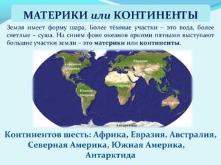 Документ описывает географические особенности Земли, включая шесть континентов: Африку, Евразию, Австралию, Северную и Южную Америку, и Антарктиду, а также четыре океана. Он подчеркивает разнообразие природных ресурсов и культур на различных континентах, таких как Азия, которая является самой большой частью света с множеством стран, и Африка, известная своими дикими животными и пустынями. Антарктида упоминается как самый холодный континент, на котором разрешена только научная деятельность.