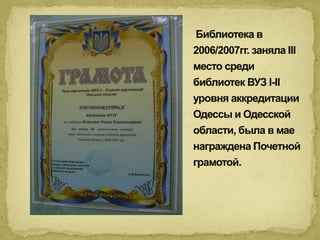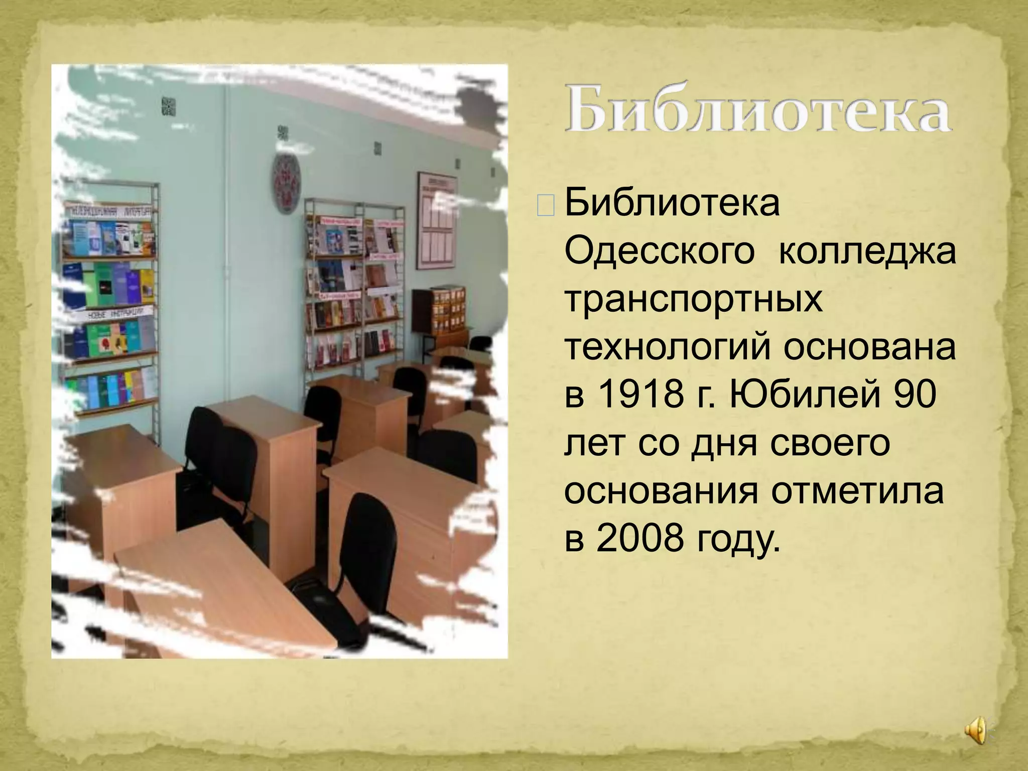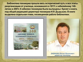 Библиотека Одесского колледжа транспортных технологий была основана в 1918 году и отметила 90-летие в 2008 году. В библиотеке, общей площадью 250 кв.м, обслуживается 1812 читателей, ежегодно проводятся тематические книжные выставки и беседы по библиотечно-библиографическим знаниям. С 2011 года создан электронный читальный зал с ПК и подключением к интернету для пользователей.