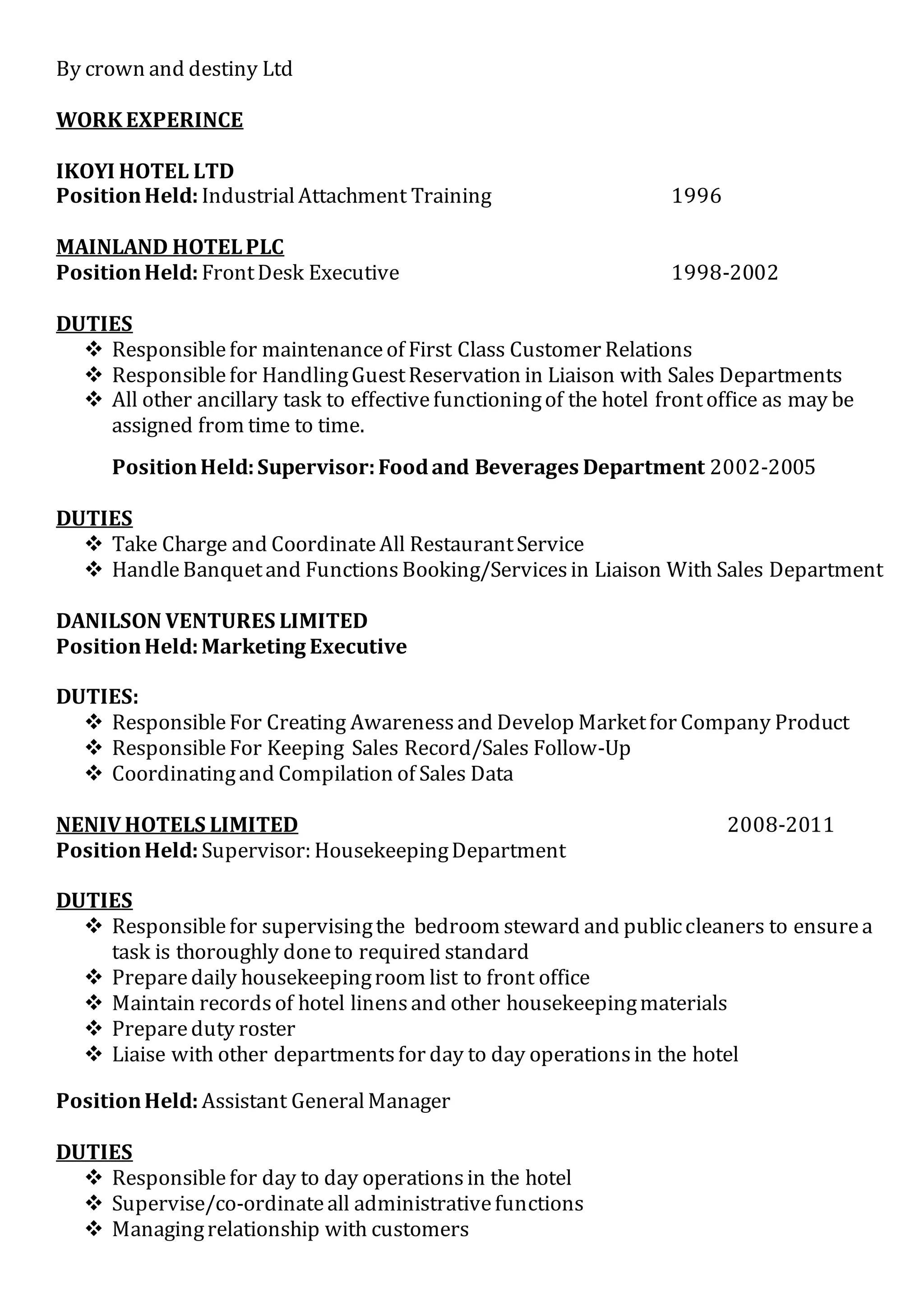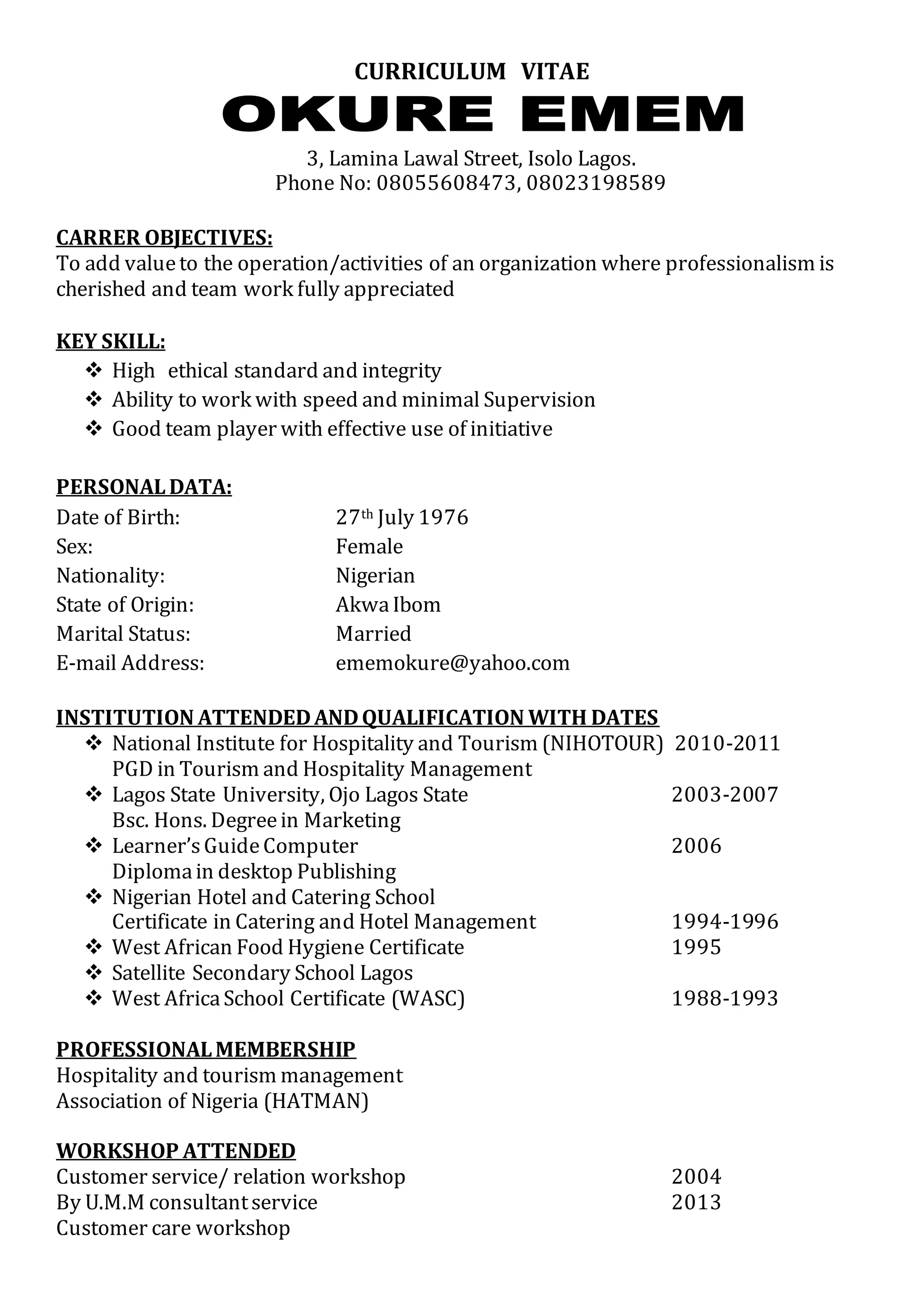 This curriculum vitae outlines the career history and qualifications of Emem Okure. She has over 20 years of experience in hospitality and healthcare management roles. Her experience includes positions as a front desk executive, food and beverage supervisor, marketing executive, housekeeping supervisor, assistant general manager, and housekeeping manager. She holds qualifications in tourism and hospitality management, marketing, desktop publishing, catering and hotel management, and food hygiene. Her objective is to contribute value to an organization that appreciates professionalism and teamwork.