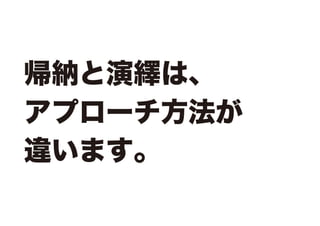 帰納的に考えていくと、「早過ぎる一般化」の罠にはまることがあります。 演繹的に考えていくと、事実をねじ曲げて考えてしまうこともあるかもしれません。 それぞれを効果的に使い分けるようにしましょう。 http://courslide.org/